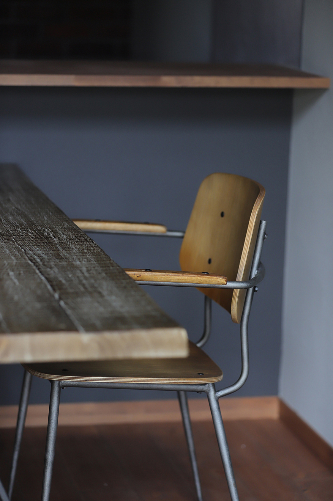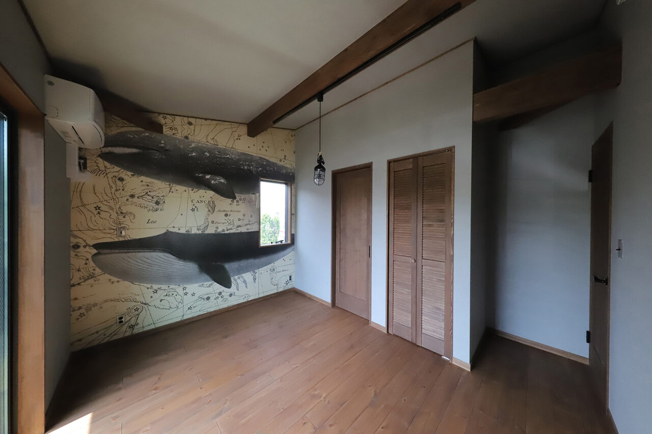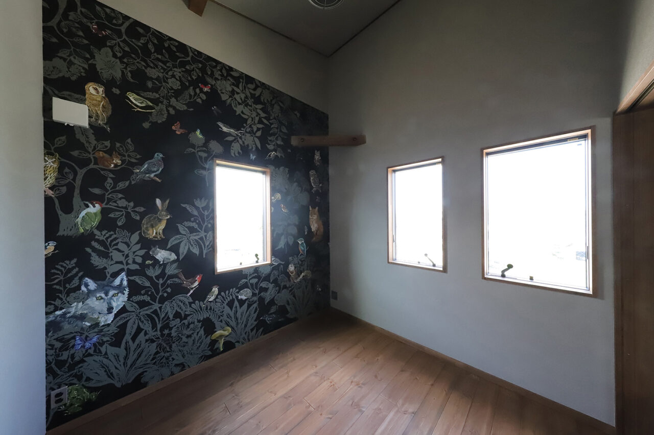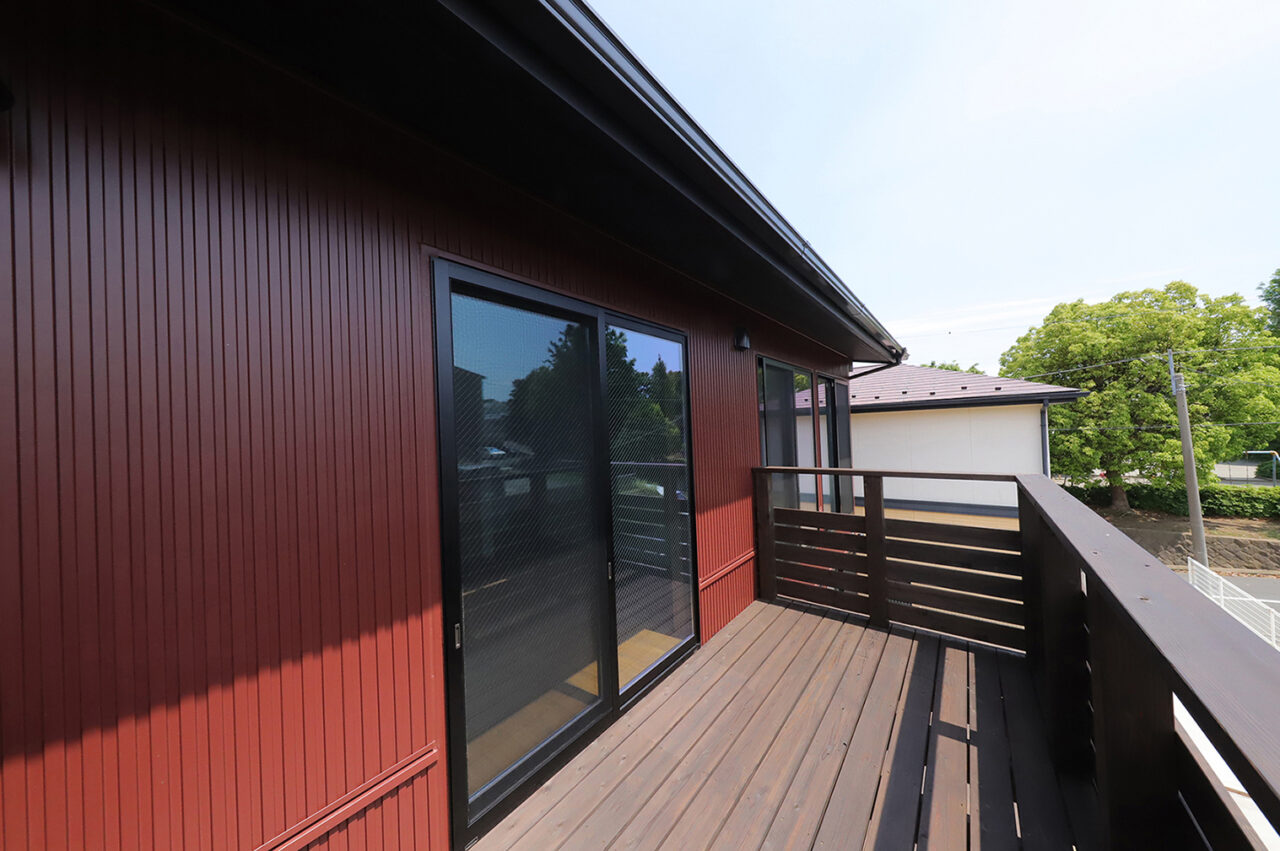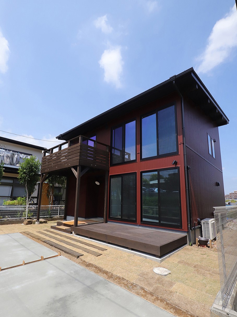 外壁には、弊社の施工事例としては珍しい オータムレッドのガルバリウムをチョイスされたこちらのオーナー様。木部にはアンティークブラウンを合わせ、外観全体が上品であたたかみのある印象に仕上がりました。室内は、木部をライトブラウンで塗装し、ベースのクロスはシンプルにグレー系で統一。随所に遊び心のあるアクセントクロスを取り入れることで、シンプルな中にも表情豊かな空間に。さらに、キッチン背面にはブリックタイルを施し、カフェ風の雰囲気を演出しています。オーナー様のひとつひとつの選択が重なり合い、シンプルでありながら個性が光る住まいが完成しました。