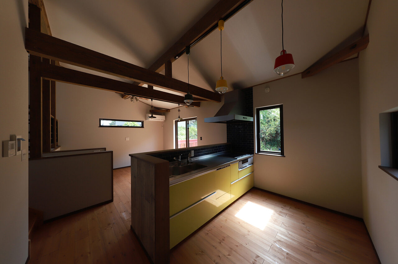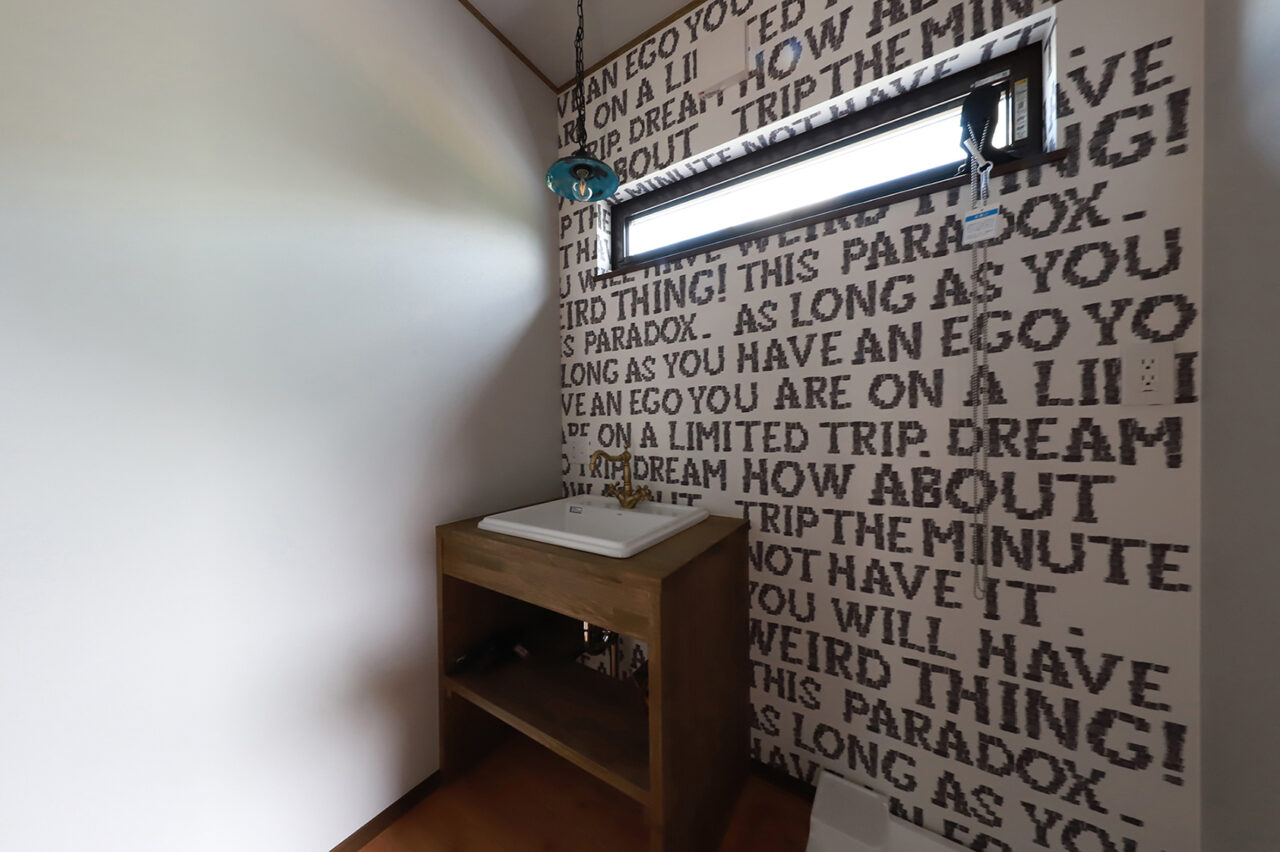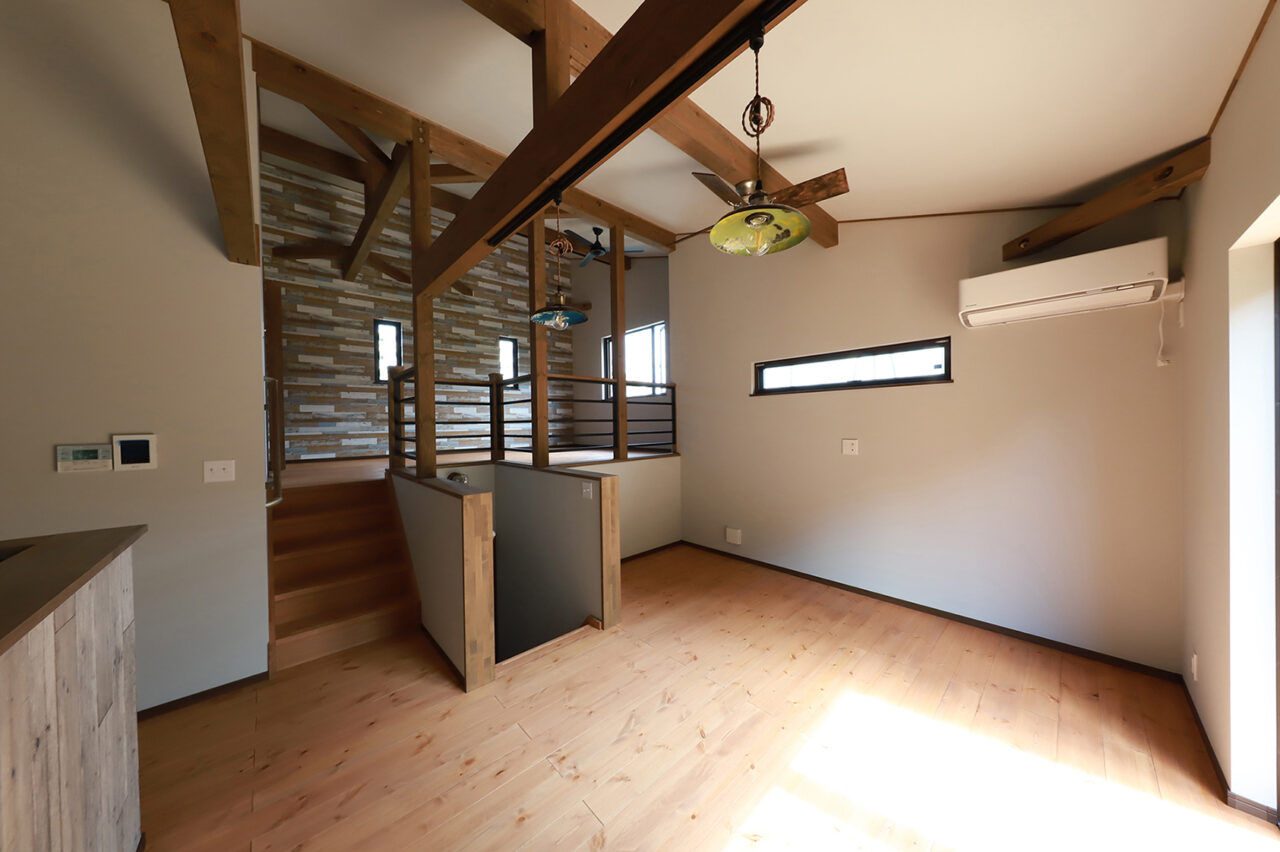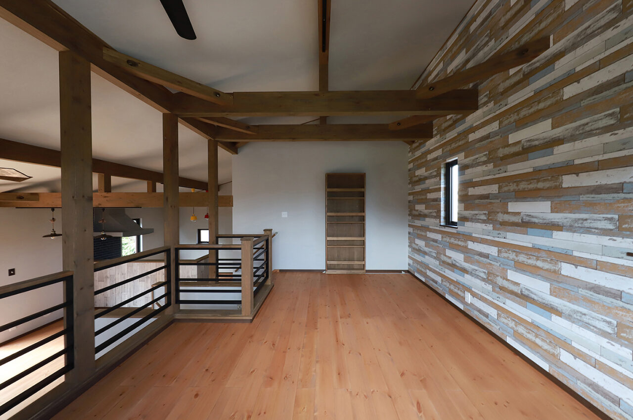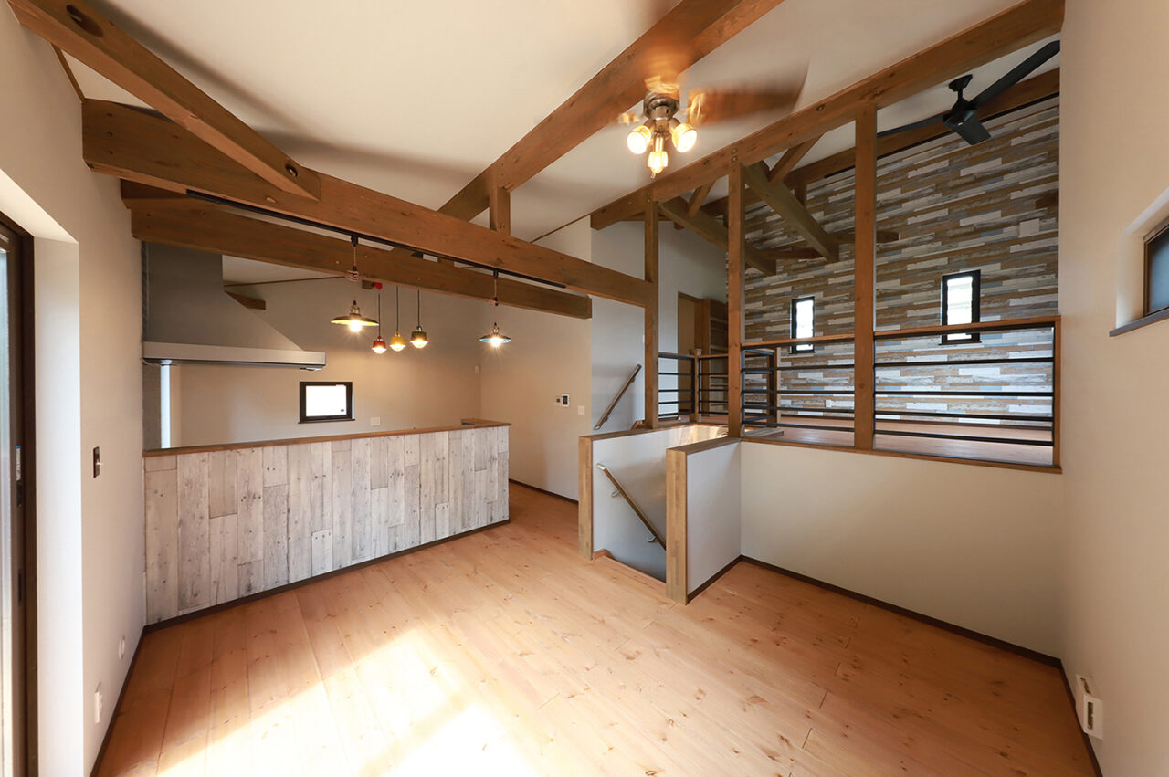 外壁は人気カラーのモスグリーンのガルバリウム鋼板を採用し、窓枠・シャッター・雨どいなどはブラウンで統一。優しい印象に仕上げたWAVEです。内装木部の床はライトオーク、梁・柱はオリーブで塗装。セカンドリビングやキッチンカウンター、洗面室には遊び心のあるアクセントクロスを取り入れ、キッチンや照明器具にカラフルな物を採用し、空間に彩りをプラスしました。楽器好きのオーナー様らしく、インサイドストッカーには防音設備を完備。趣味も暮らしも、存分に楽しめる住まいです。