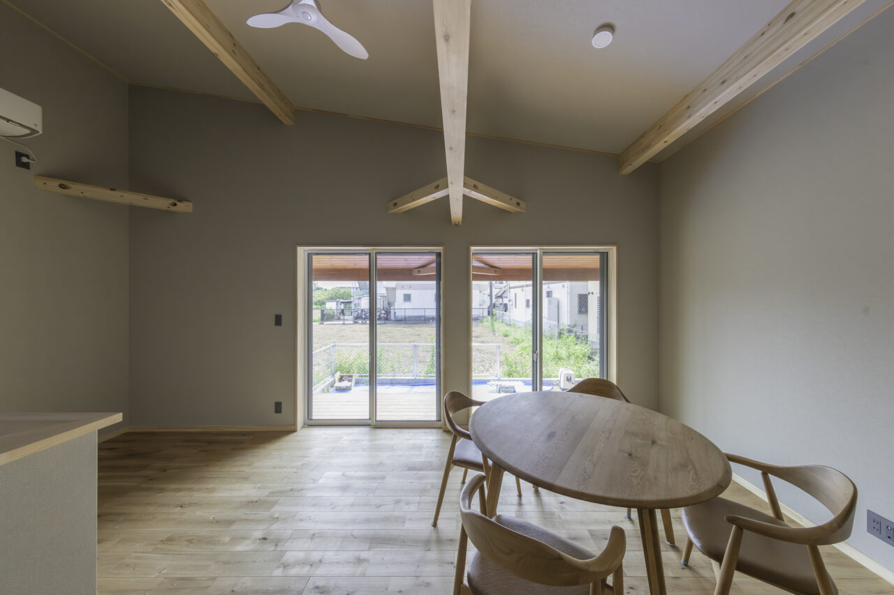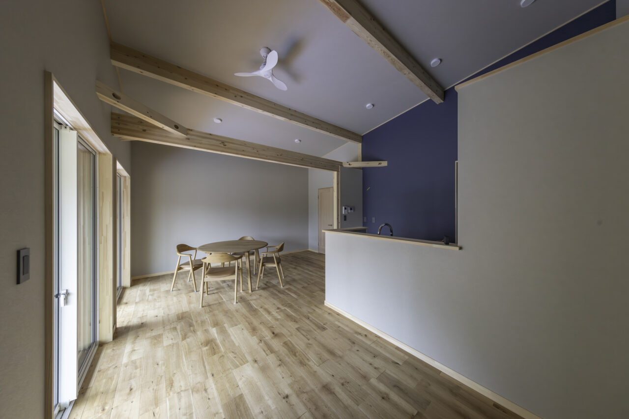 東京から湘南へ移住されたご夫婦がこれからの暮らしを見据え選ばれたのは、平屋プラン「COVACO」をベースにアレンジした24坪の住まいです。将来、使われない部屋が生まれないよう個室は最小限に抑え、その分リビングや水まわりをゆったりと計画。ご夫婦ふたりが心地よく暮らせる、シンプルで無駄のない間取りに仕上げました。水まわりは「洗う・干す・しまう」が一直線につながる家事動線を採用。ペット用品も収納できる土間収納を設け、日々の暮らしやすさにも配慮しています。お料理好きの奥様がこだわったキッチンは、ショールームで選んだクリナップ製。使い勝手とデザイン性を兼ね備えた、毎日立つのが楽しみになる空間です。リビングから続くウッドデッキと庭は、愛犬と過ごすための大切な場所。ウッドデッキはドッグランのように使える広さを確保し、湘南の景色を楽しめる外空間となりました。寝室はひとつの空間をゆるやかに仕切り、同じ場所にいながらもそれぞれの時間を大切にできる工夫を。ネイビーを基調とした外観は、実際に見学されたオーナー邸を参考に決定しています。これからの人生を、愛犬とともに心地よく過ごすための「ちょうどいい暮らし」が詰まった一邸です。