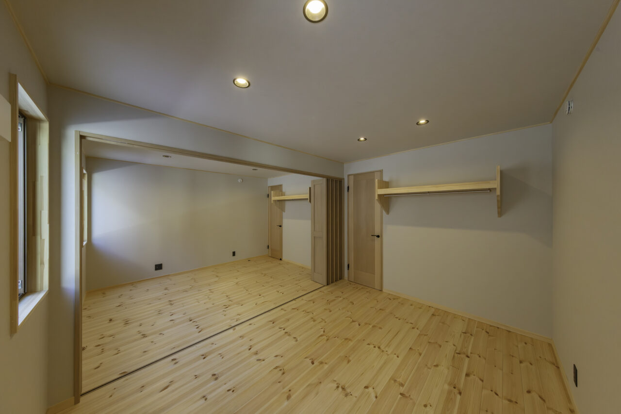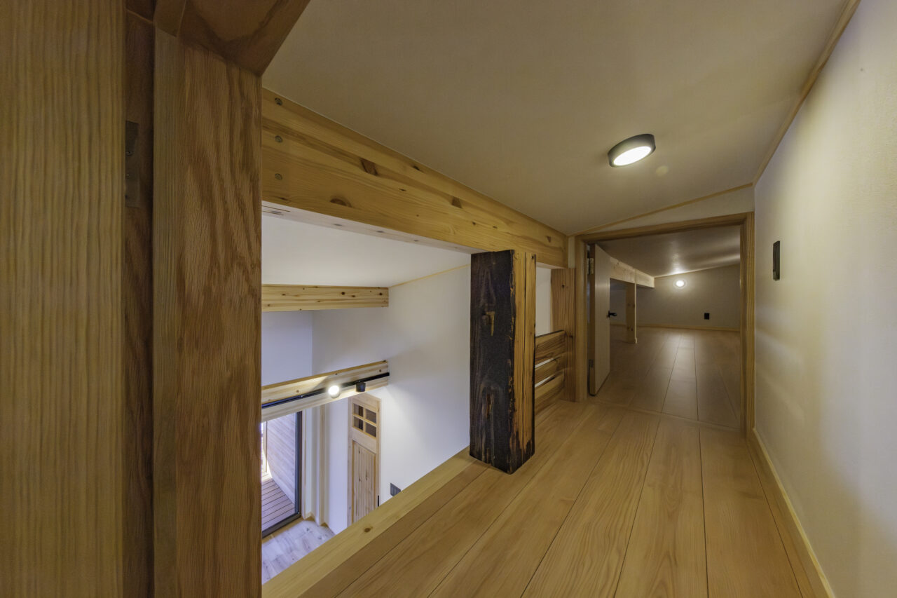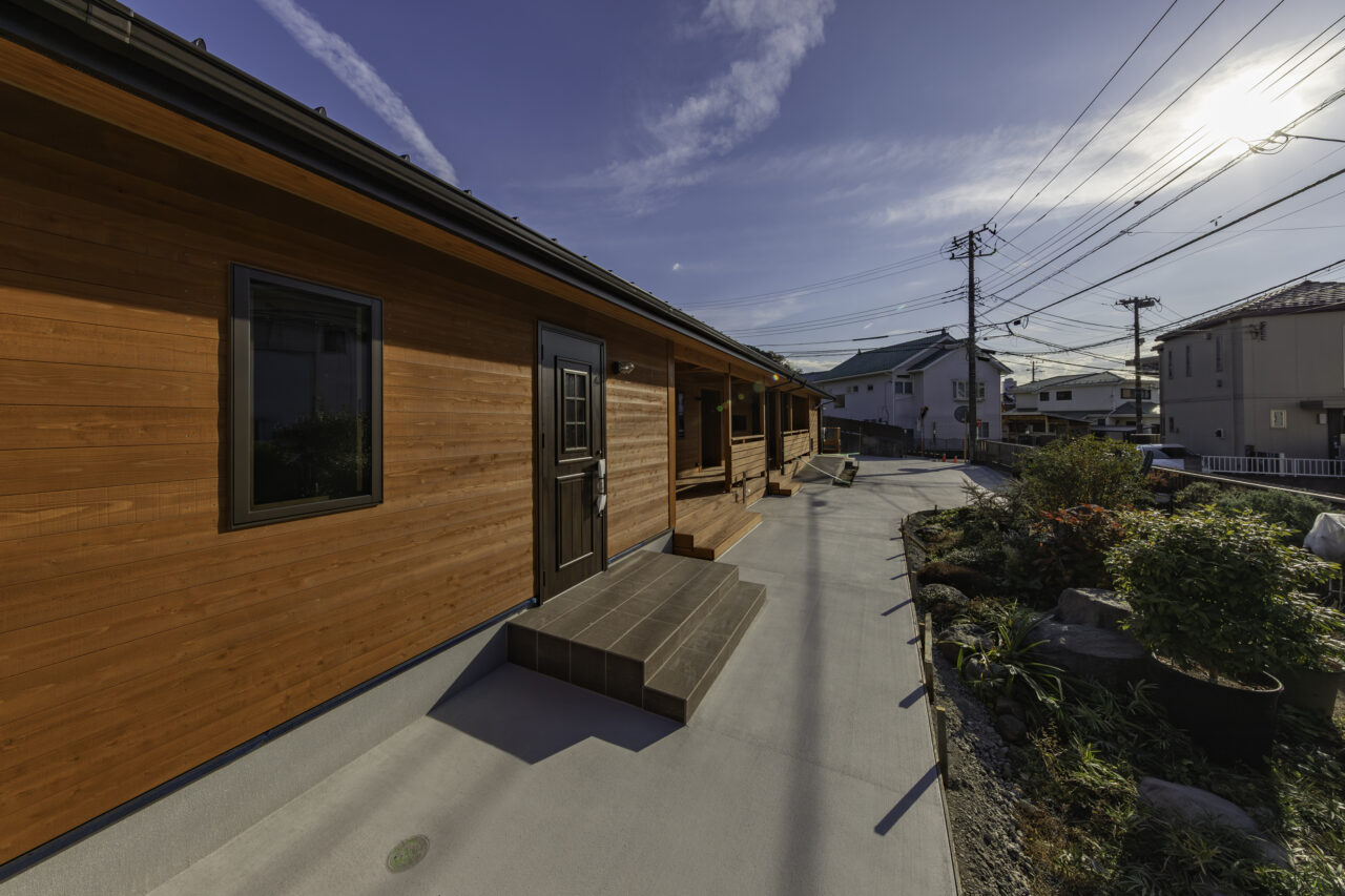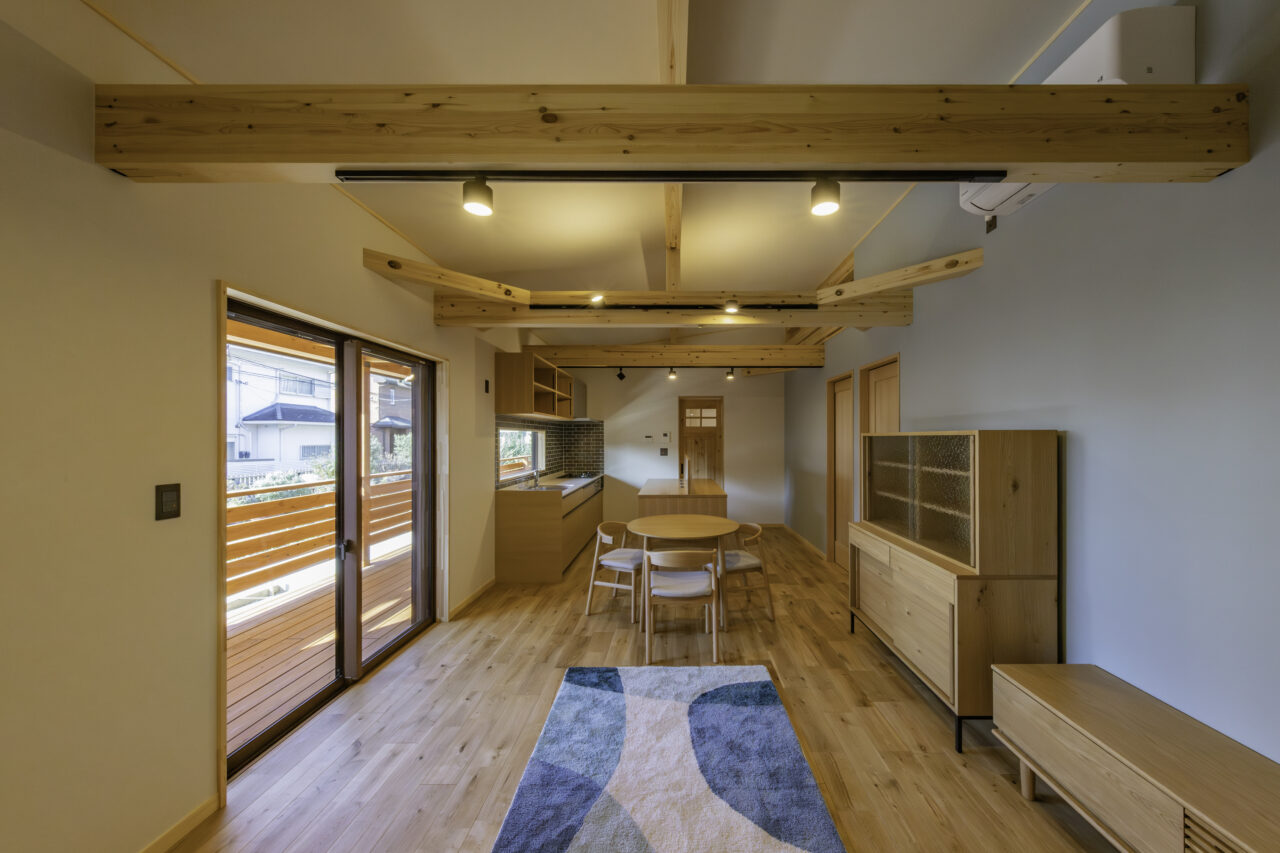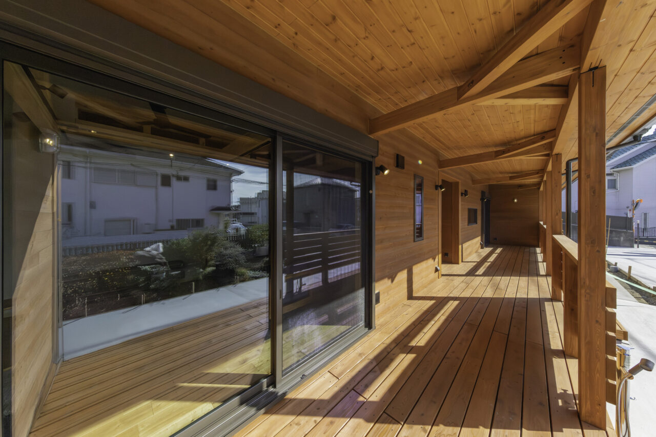 代々受け継がれてきた大切な土地に、二つの家族が心地よく暮らす二世帯住宅が完成しました。外観正面には、建物全体を引き締める 板張り仕上げ を採用。その佇まいは存在感がありながらも、周囲の景色にやさしく馴染みます。さらに正面には ワイドなウッドデッキとカバードポーチ を設け、二つの住まいをゆるやかにつなぐ、家族共有の外空間としました。室内は、それぞれ 3LDK・4LDK の独立した住空間を確保しつつ、中央にホールと扉を設けることで、必要なときには気軽に行き来が可能。日常のプライバシーを守りながらも、家族の気配を感じられる“ちょうどいい距離感”を実現しています。つながりすぎない、離れすぎない。今の暮らし方に寄り添った、新しい二世帯住宅のかたちです。