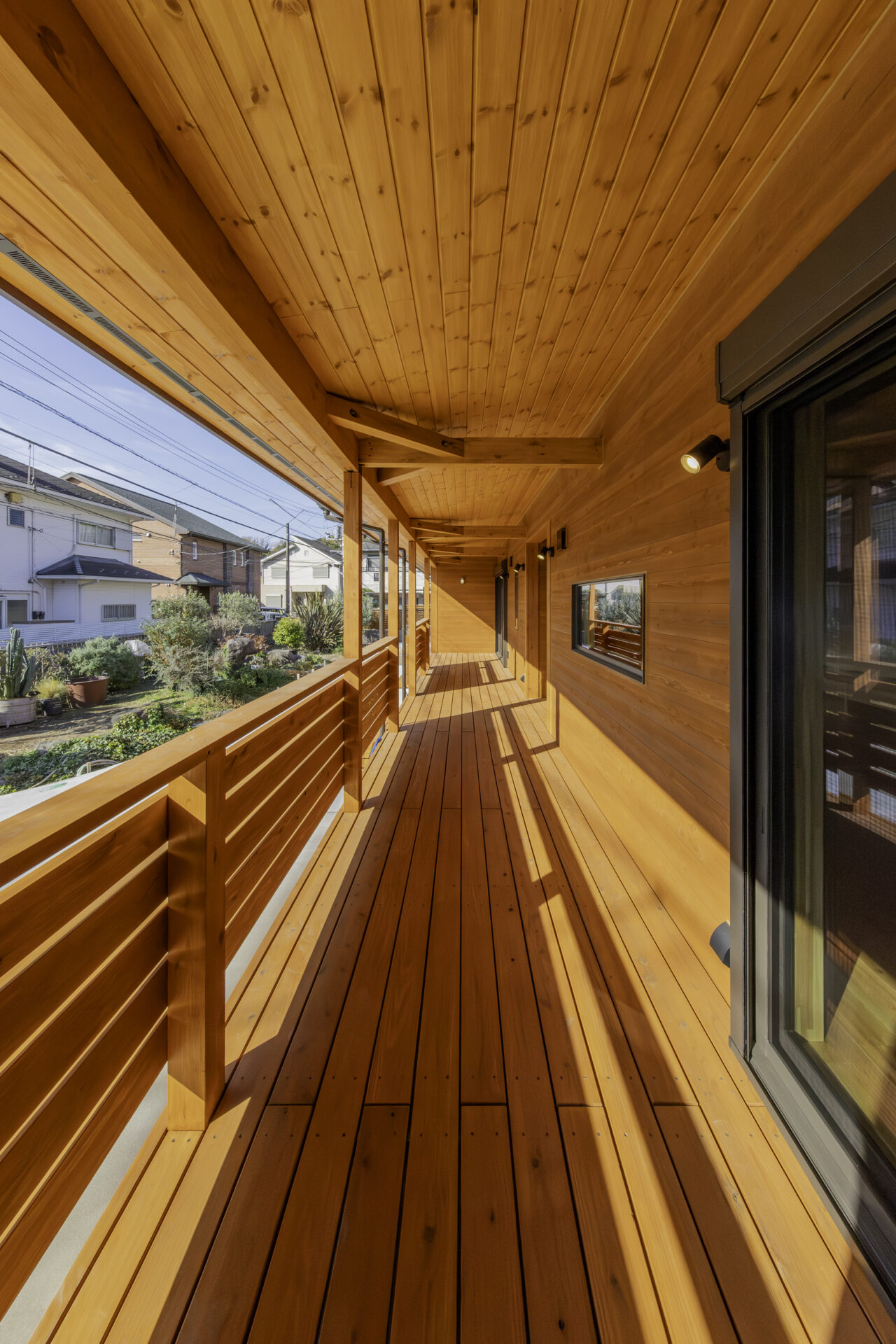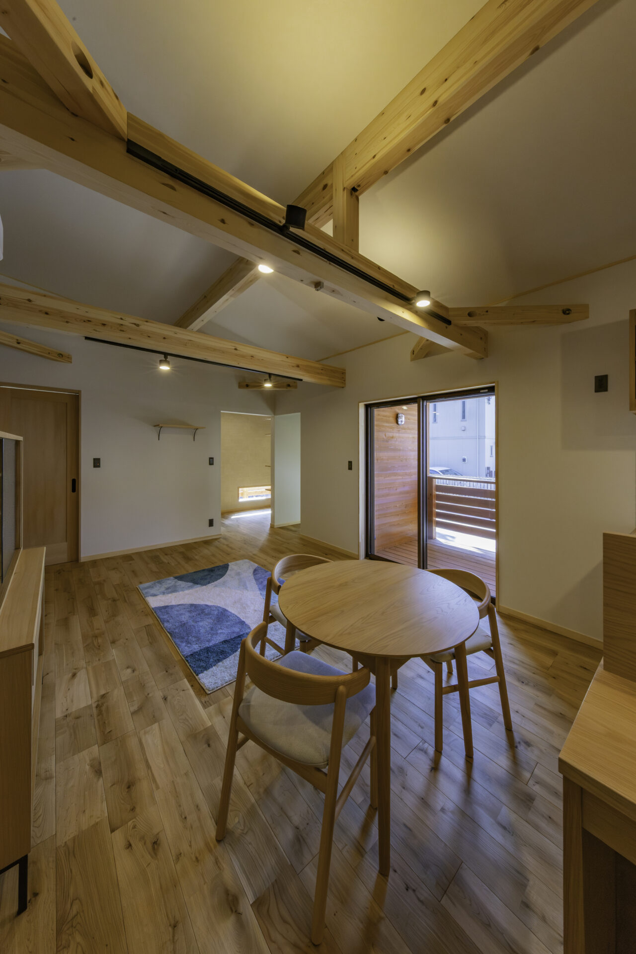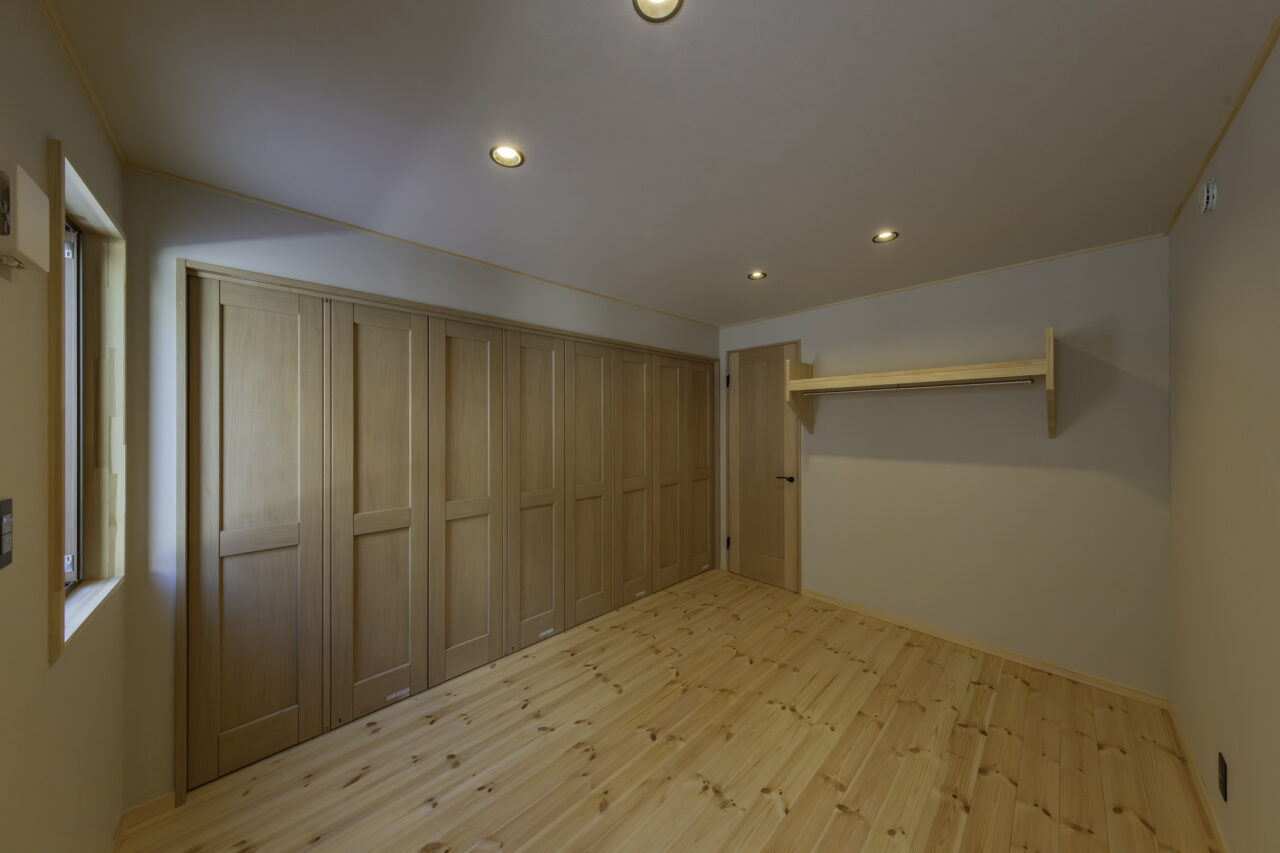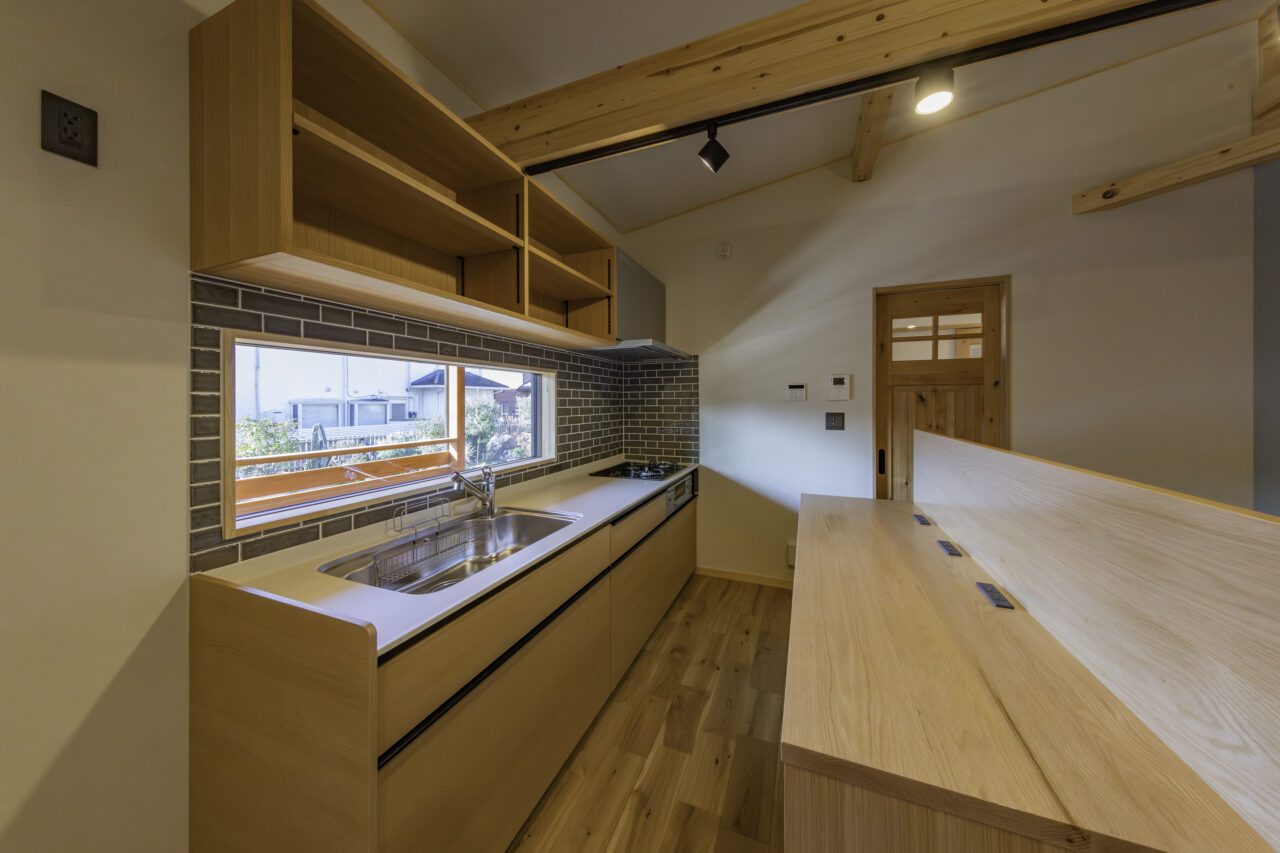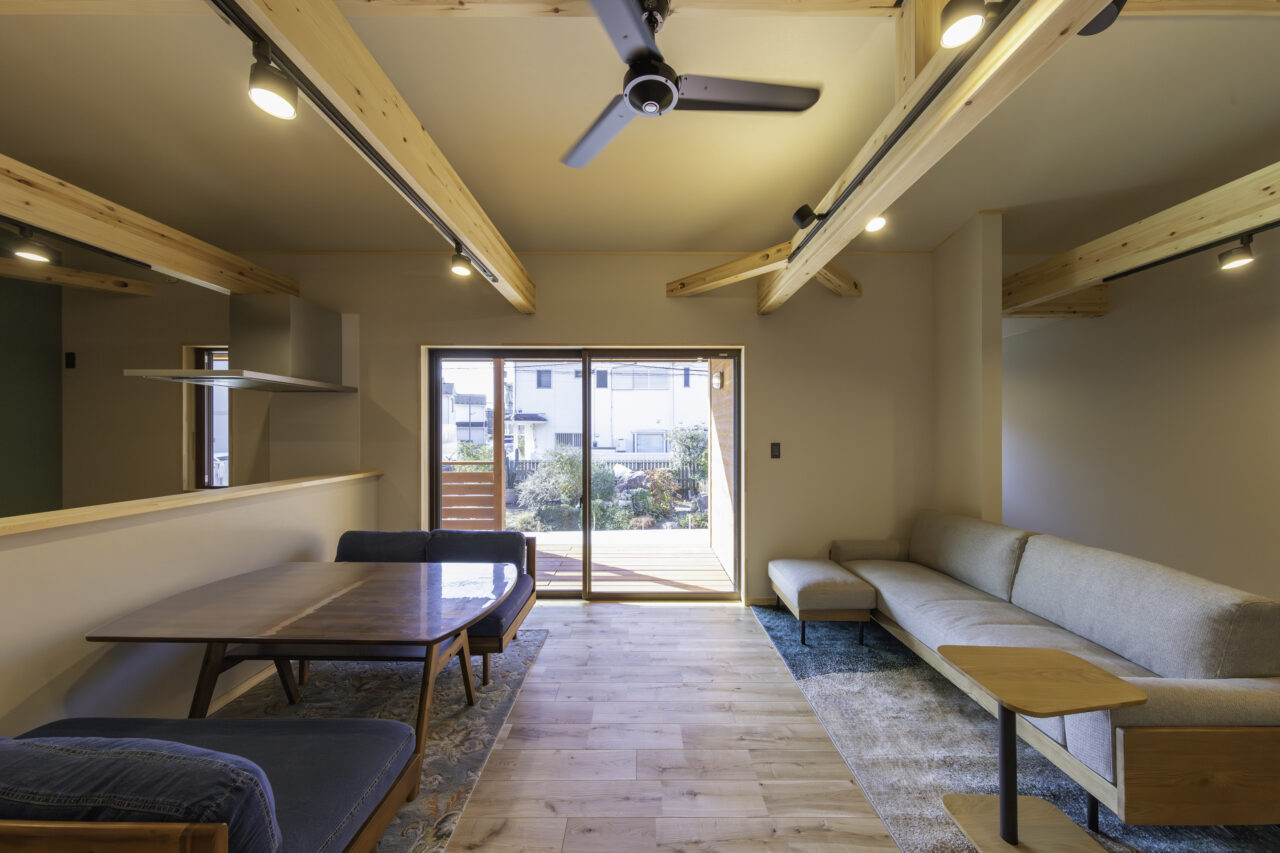 代々受け継がれてきた大切な土地に、二つの家族が心地よく暮らす二世帯住宅が完成しました。外観正面には、建物全体を引き締める 板張り仕上げ を採用。その佇まいは存在感がありながらも、周囲の景色にやさしく馴染みます。さらに正面には ワイドなウッドデッキとカバードポーチ を設け、二つの住まいをゆるやかにつなぐ、家族共有の外空間としました。室内は、それぞれ 3LDK・4LDK の独立した住空間を確保しつつ、中央にホールと扉を設けることで、必要なときには気軽に行き来が可能。日常のプライバシーを守りながらも、家族の気配を感じられる“ちょうどいい距離感”を実現しています。つながりすぎない、離れすぎない。今の暮らし方に寄り添った、新しい二世帯住宅のかたちです。
