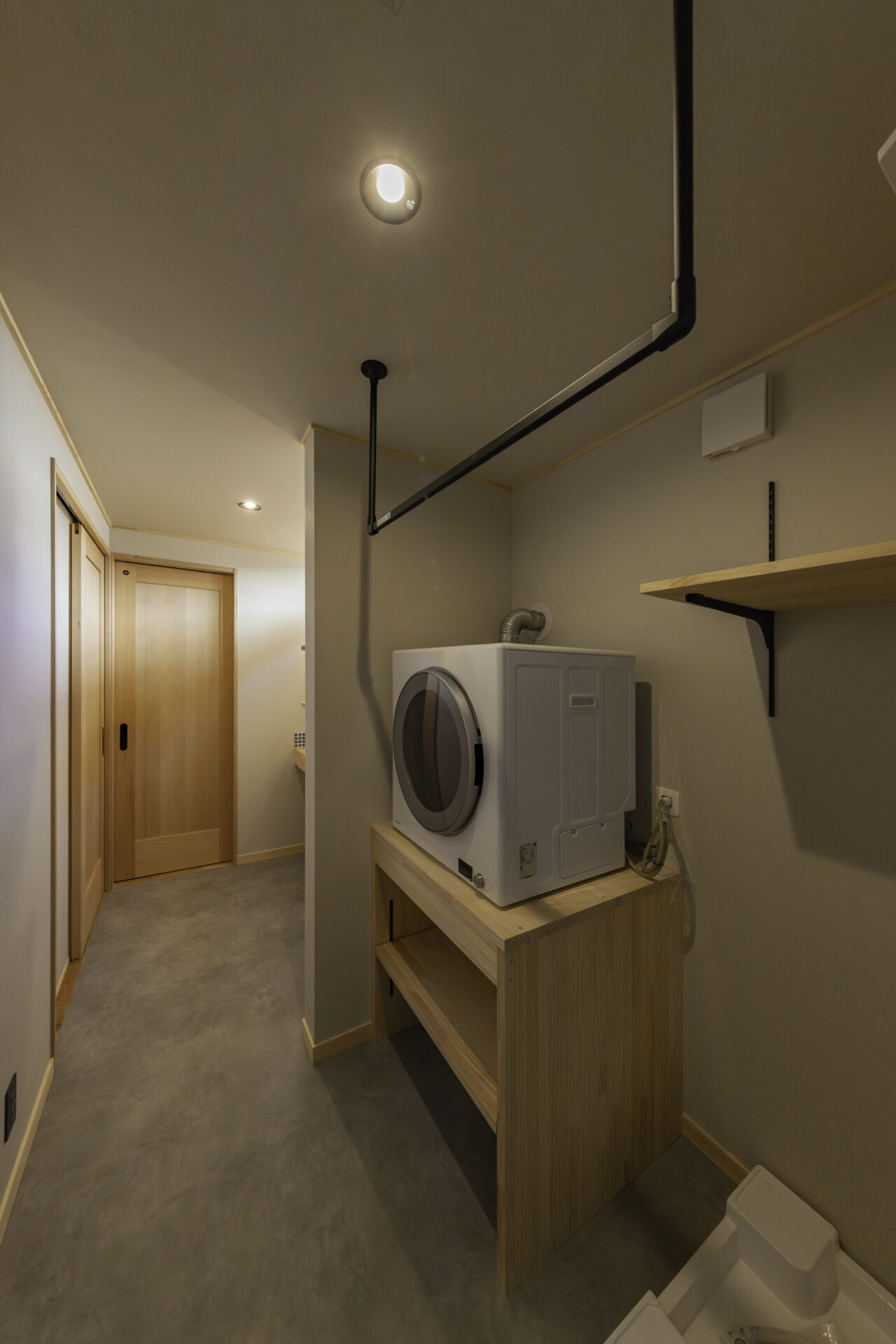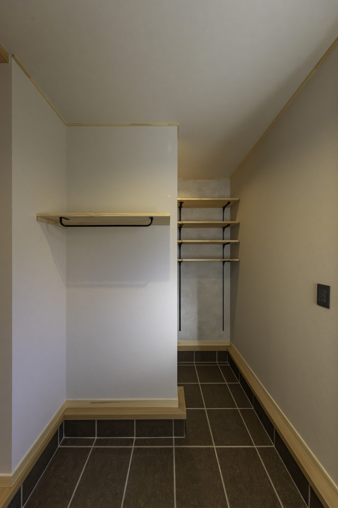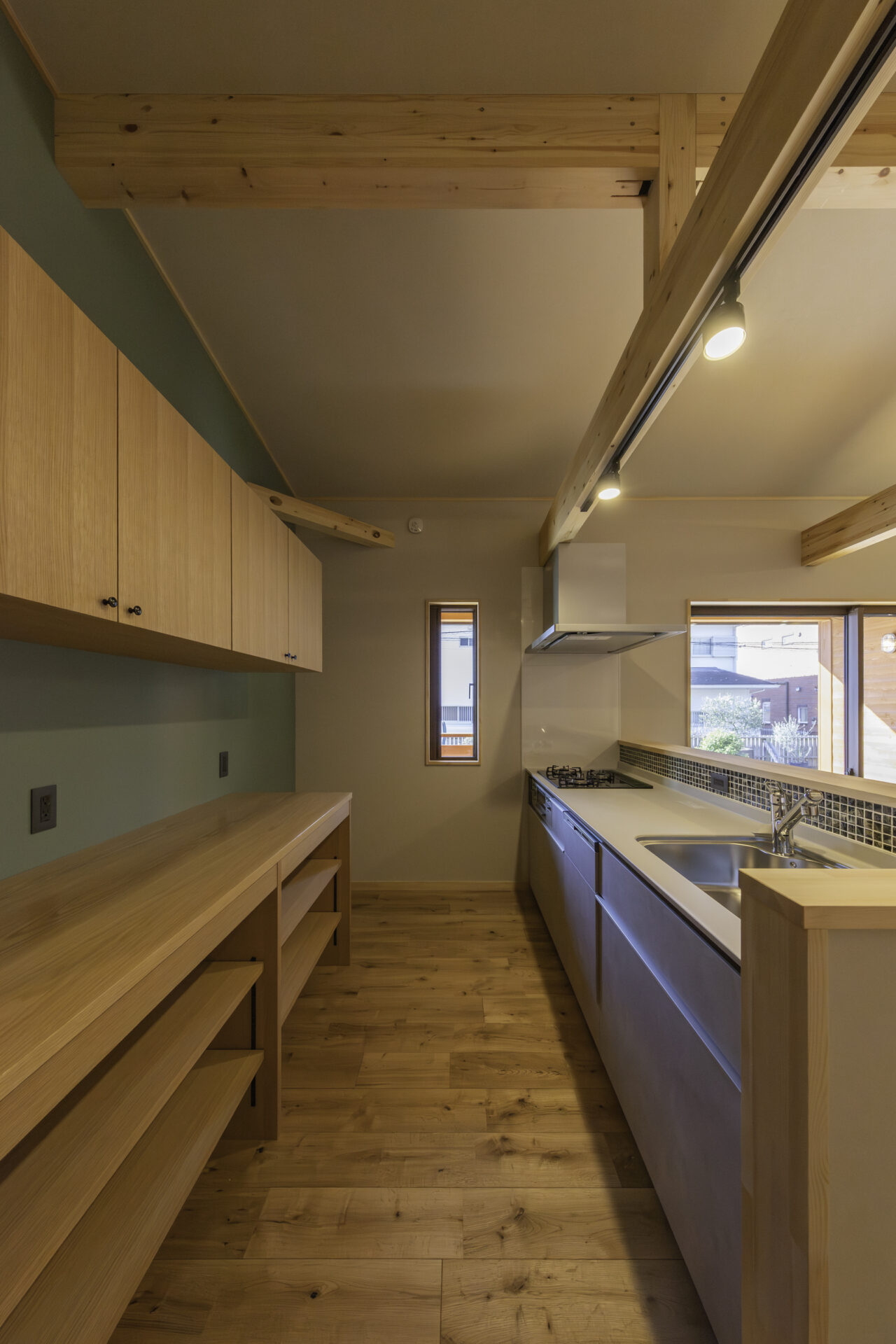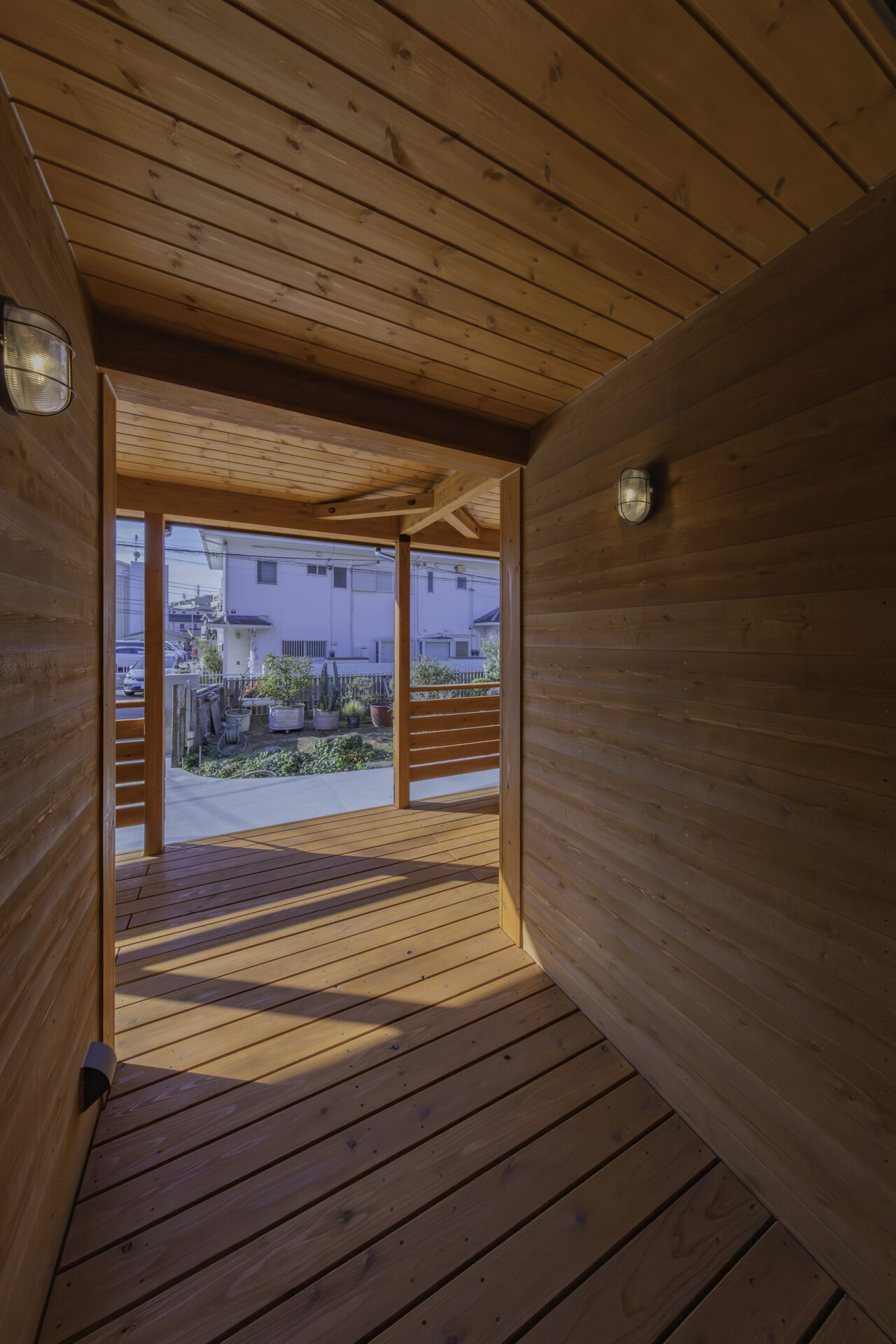 代々受け継がれてきた大切な土地に、二つの家族が心地よく暮らす二世帯住宅が完成しました。外観正面には、建物全体を引き締める 板張り仕上げ を採用。その佇まいは存在感がありながらも、周囲の景色にやさしく馴染みます。さらに正面には ワイドなウッドデッキとカバードポーチ を設け、二つの住まいをゆるやかにつなぐ、家族共有の外空間としました。室内は、それぞれ 3LDK・4LDK の独立した住空間を確保しつつ、中央にホールと扉を設けることで、必要なときには気軽に行き来が可能。日常のプライバシーを守りながらも、家族の気配を感じられる“ちょうどいい距離感”を実現しています。つながりすぎない、離れすぎない。今の暮らし方に寄り添った、新しい二世帯住宅のかたちです。