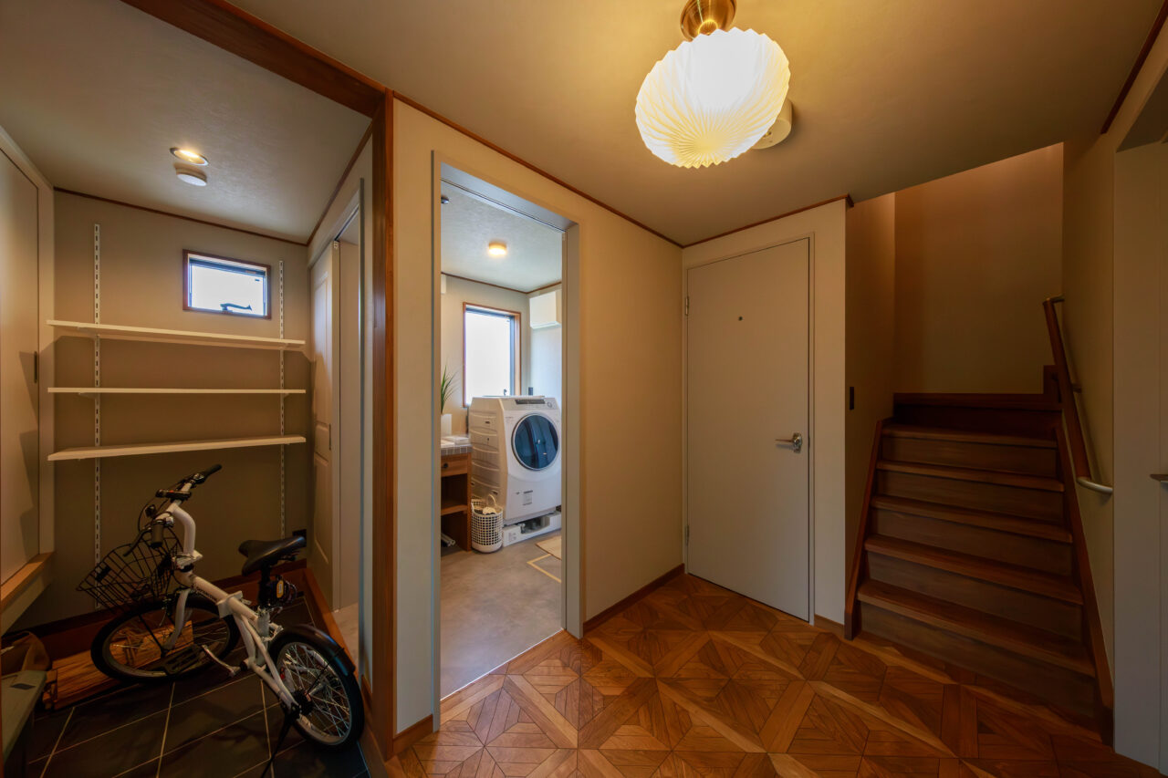 ワイドタイプ玄関でたっぷり靴収納+洗面所へウォークスルーできる嬉しい間取り。