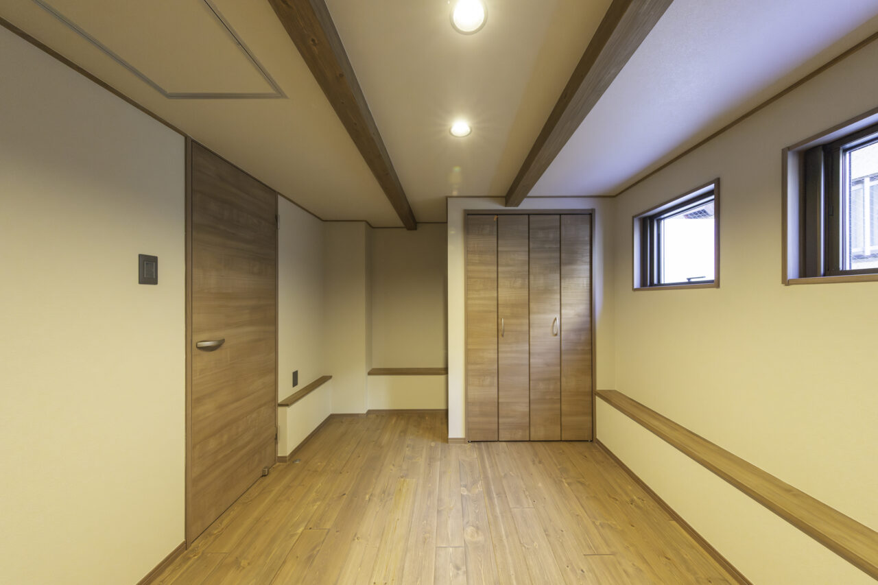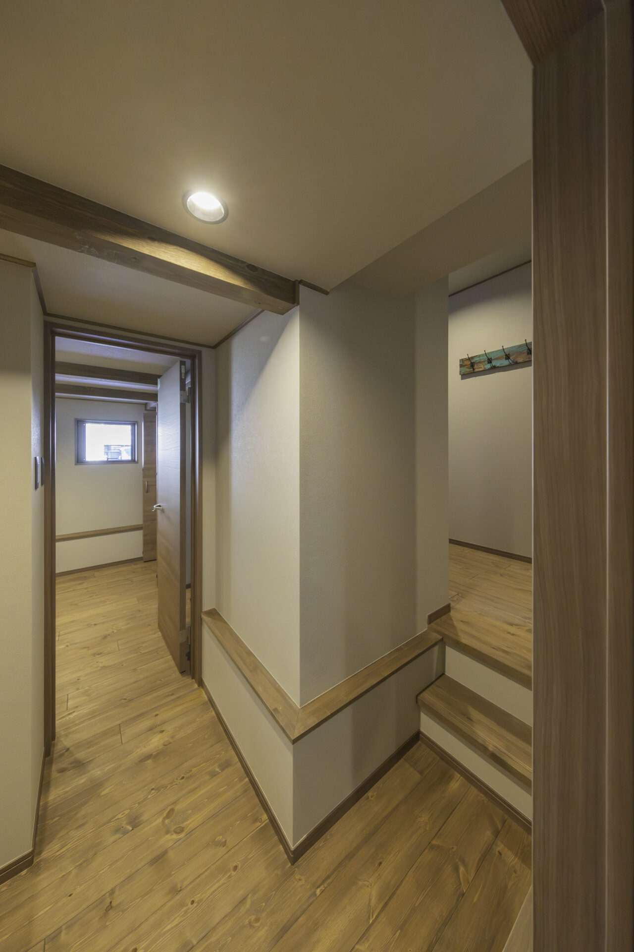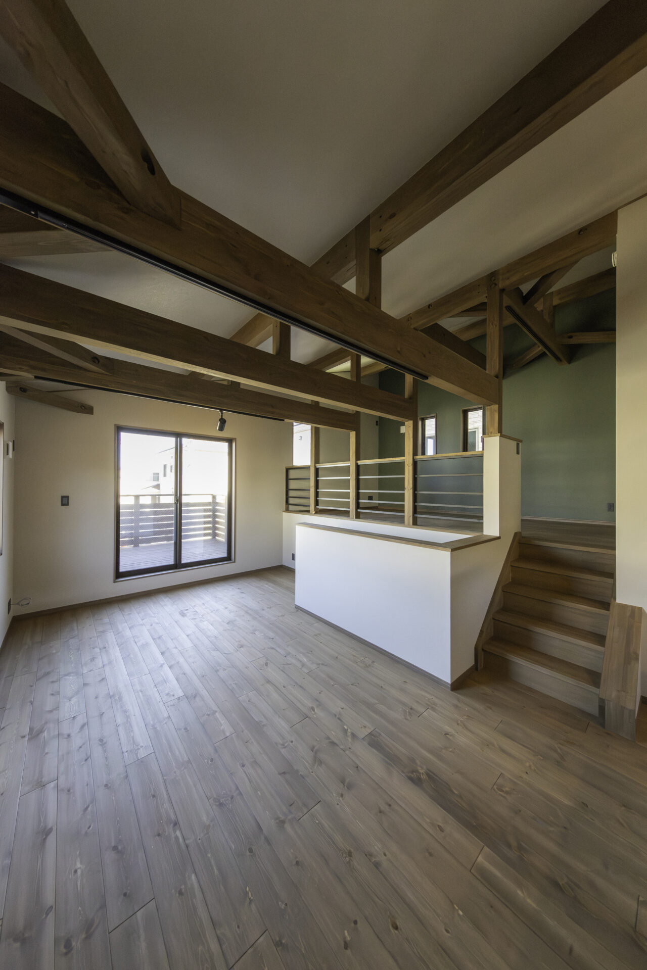 人気のスキップフロアプラン「WAVE」をベースに、ご家族の暮らし方に合わせてカスタマイズした住まいが完成しました。今回のプランでは、従来のアウトドアストッカーをあえて設けず、0.5F部分をインサイドストッカー2部屋+ウォークインクローゼットへと変更。室内動線の中で使いやすい、収納力と利便性を高めた空間へと仕上げています。玄関まわりもゆとりを持たせ、より使いやすい動線計画となっています。また、1.5Fからつながるウッドバルコニーは、標準よりも奥行きを広げたことで、開放感のある外部空間に。洗濯スペースとしてはもちろん、BBQやお子さまのプールなど、暮らしの楽しみが広がる場所となりました。室内の木部には“オリーブ”カラーを採用。落ち着きと深みのある色合いが、空間全体にやわらかな統一感をもたらしています。住まい手のライフスタイルに寄り添いながら、WAVEの魅力をさらに引き出した一邸です。