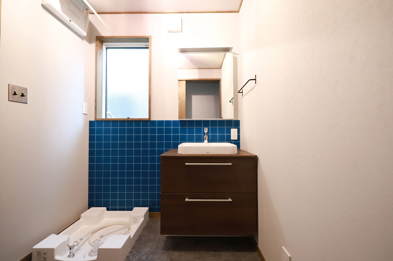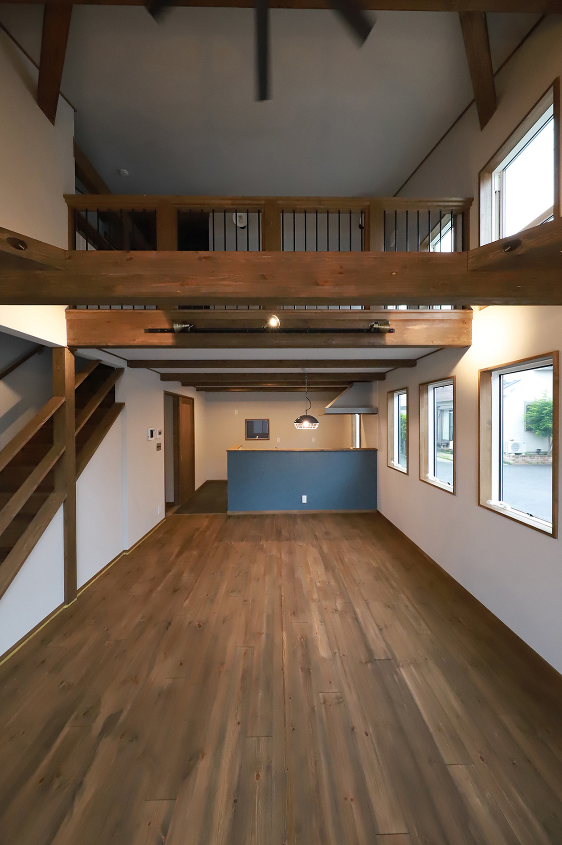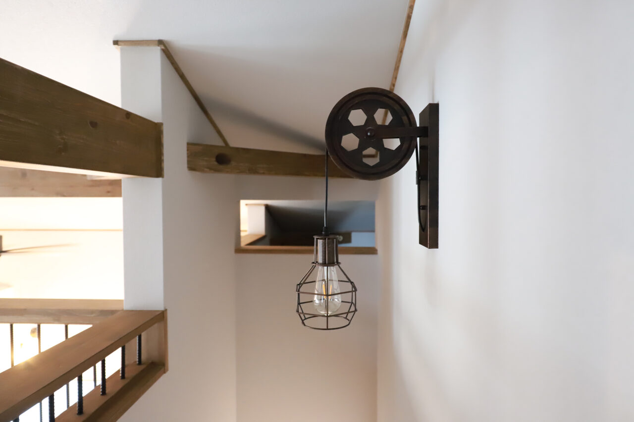 外壁には人気のモスグリーンのガルバリウム鋼板を採用し、木部はダークオークで塗装。落ち着きのある印象に仕上げたLOAFERです。内装の木部はオリーブ色で統一し、キッチンカウンターや洗面スペースにはグリーンやブルーのクロスを差し色に取り入れることで、全体が重くなりすぎず、爽やかさも感じられる空間に。吹き抜けのフリースペースの手すりや照明にはアイアンを取り入れ、程よくインダストリアルなテイストをプラスしました。木の温もりと無骨さが調和した、居心地の良い住まいです。