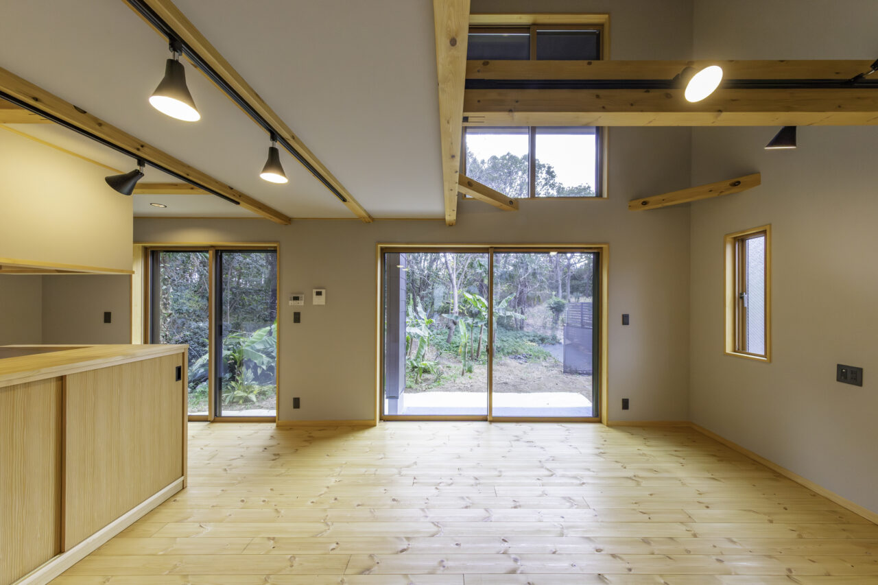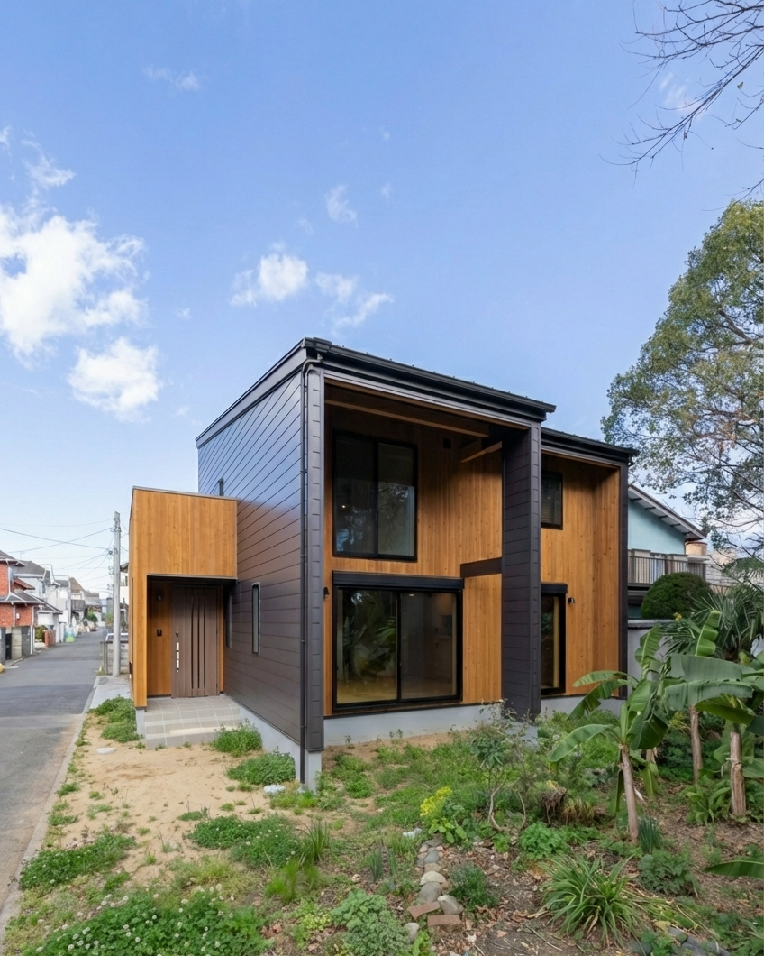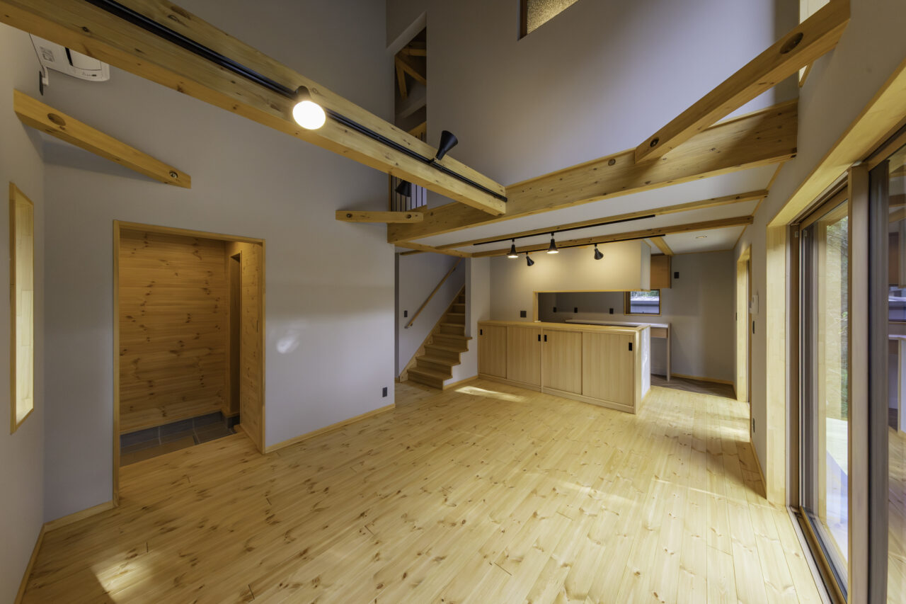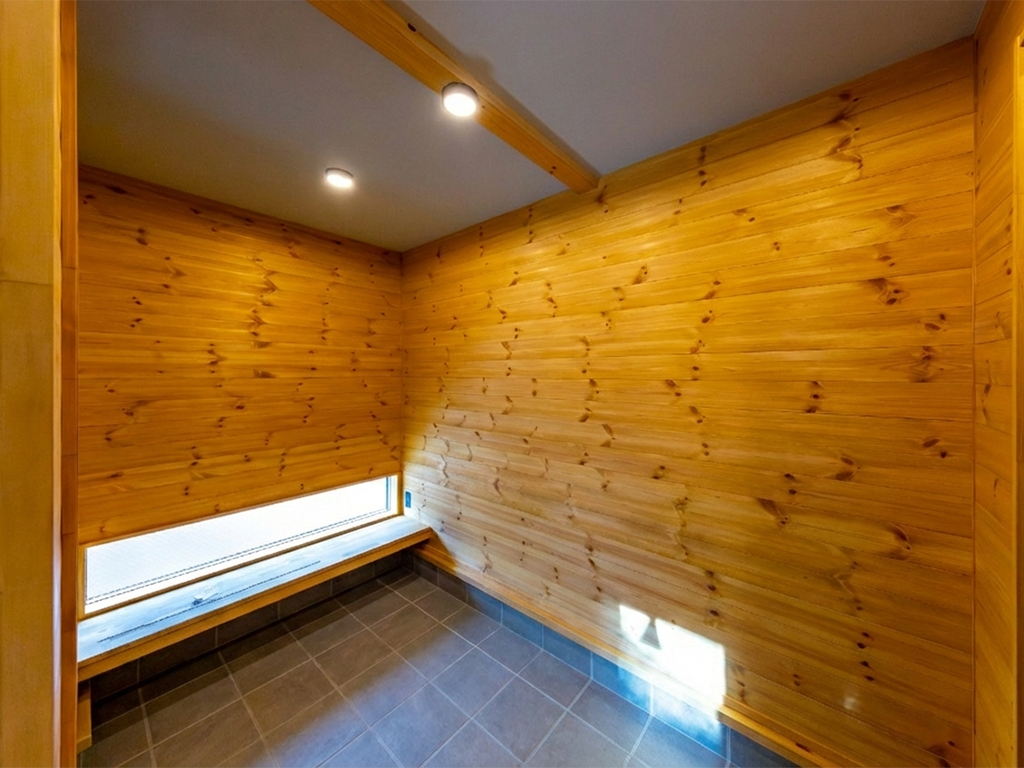初めての見学会へのご来場から約3年。再び足を運んでいただき、じっくりと時間を重ねて完成したBOOOTSの住まいです。外観は、ブラックメタリウムのガルバリウム鋼板に、ナチュラルオーク色で塗装した木部を組み合わせ、周囲の自然に溶け込む落ち着いた佇まいに。BOOOTSをベースに、弊社オリジナルプラン「GLAMP」のエッセンスを取り入れた“いいとこ取り”のプランは、ご友人ご夫婦が建てられた住まいからのヒントも活かしながら、ご夫婦の想いを丁寧にかたちにしています。南側には借景を最大限に活かすため、大きな窓を配置。ご家族が1階で過ごす時間を大切にできるよう、家事動線に配慮しつつ、景色を身近に感じながら心地よく過ごせる空間としました。玄関には、靴の脱ぎ履きはもちろん、ご近所の方が立ち寄った際にも気軽に腰掛けられるベンチを設置。壁面は板張り仕上げとし、住まいの“顔”として温もりのある空間を演出しています。家族用と来客用の動線を分けることで、買い物帰りにはシューズインクロークを通って、そのままダイニングへ向かえる使い勝手の良さも魅力です。1階には和室を設け、ご両親が泊まりに来られた際にも安心。吹き抜け天井には木目調のクロスを使用し、視線の抜けとやさしい雰囲気を両立しています。キッチンや洗面室の床にはヘリンボーン調のクッションフロアを用い、見た目の美しさとコストバランスにも配慮しました。2階には個室を3部屋と大容量のウォークインクローゼットを完備。天井高のあるお部屋にはロフトを設け、季節物の収納にも対応しています。また、西面にはバルコニーを設け、条件が揃えば富士山を望むこともでき、日常の中でふと特別な景色に出会えるのも、この住まいならではの魅力です。自然を身近に感じながら、暮らしやすさにも細やかに配慮した、永く愛せる一棟に仕上がりました。